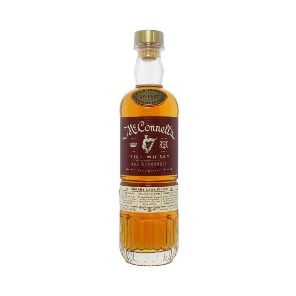 Το McConnell’s Sherry Cask Finish είναι ένα εκλεπτυσμένο ιρλανδικό ουίσκι που ξεχωρίζει για τον πλούσιο και ζεστό χαρακτήρα του, αποτέλεσμα της διπλής ωρίμανσης. Αρχικά παλαιώνει για 5 χρόνια σε επιλεγμένα βαρέλια bourbon πρώτης πλήρωσης και στη συνέχεια ολοκληρώνει την παλαίωσή του σε βαρέλια Oloroso sherry, τα οποία του χαρίζουν βάθος και πολυπλοκότητα. Με αλκοολικό βαθμό 46% και χωρίς ψυχρή διήθηση, διατηρεί τον αυθεντικό του χαρακτήρα και τη γεμάτη υφή του. Στη μύτη αναδύονται έντονα αρώματα αποξηραμένων φρούτων όπως σύκα και σταφίδες, μαζί με νότες μαύρης σοκολάτας, κανέλας και μοσχοκάρυδου, ενώ διακριτικές πινελιές δέρματος προσθέτουν βάθος. Στο στόμα είναι πλούσιο και ισορροπημένο, με γεύσεις καστανής ζάχαρης, ώριμων κερασιών, βατόμουρων και κόκκινων μήλων, που συνδυάζονται με αποχρώσεις πικρής σοκολάτας. Η επίγευση είναι μακρά και ζεστή, με νότες δρυός, γαρύφαλλου και ελαφριάς πικάντικης έντασης που παραμένουν ευχάριστα. Πρόκειται για ένα ισορροπημένο και γεμάτο ιρλανδικό ουίσκι, ιδανικό για όσους αγαπούν τα sherry cask finishes και αναζητούν έναν συνδυασμό γλυκύτητας, φρούτου και μπαχαρικών, απολαμβάνοντάς το είτε σκέτο είτε με λίγο πάγο.